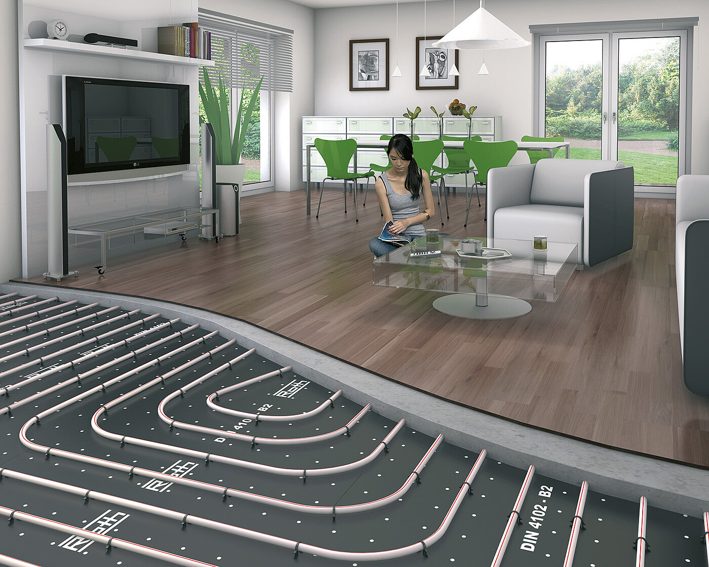 Auf dem Boden erfolgt die Befestigung der Systemrohre in der Regel mit einer Systemplatte, welche die Systemrohre eigenstabil aufzunehmen vermag und dabei auch den Anforderungen des Trittschalls entspricht. Etwaige notwendige Wärmedämmungen sind nicht Systembestandteil der Flächentemperierung und sind bauseits zu stellen.