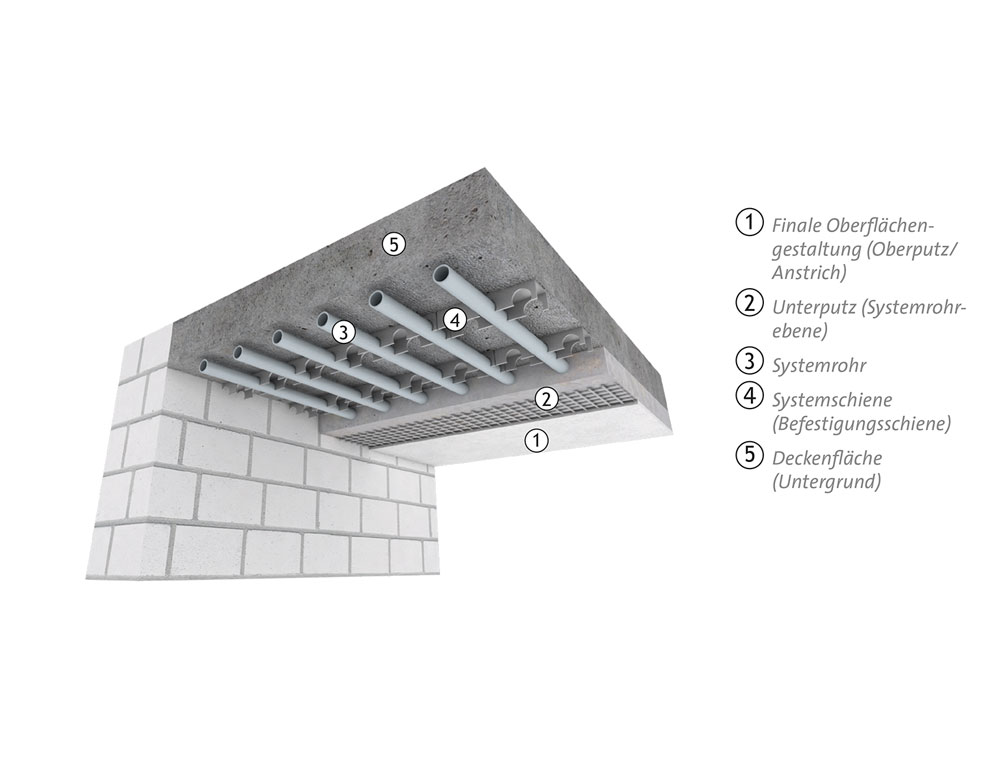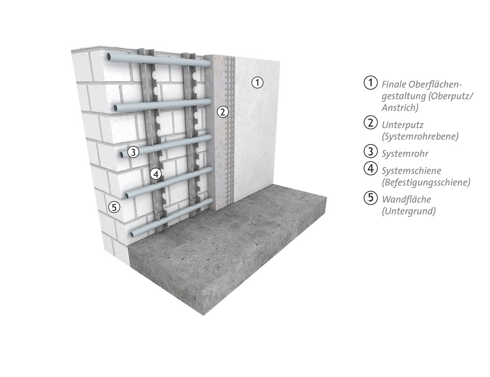 Die Unterputzlage, welche das Systemrohr entsprechend seines Außendurchmesser vollständig umfasst, bildet die Systemrohrebene. Die Aufbaudicke der Unterputzlage entspricht dabei dem Außendurchmesser des Systemrohres, inkl. dessen Befestigungsschiene. Bevor der finale Oberputz mit einer Dicke von maximal 10 mm aufgetragen werden kann, wird ein Armierungsgewebe eingebracht, um Rissbildungen an den Wand- und/oder Deckenflächen zu vermeiden.